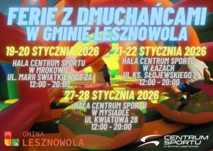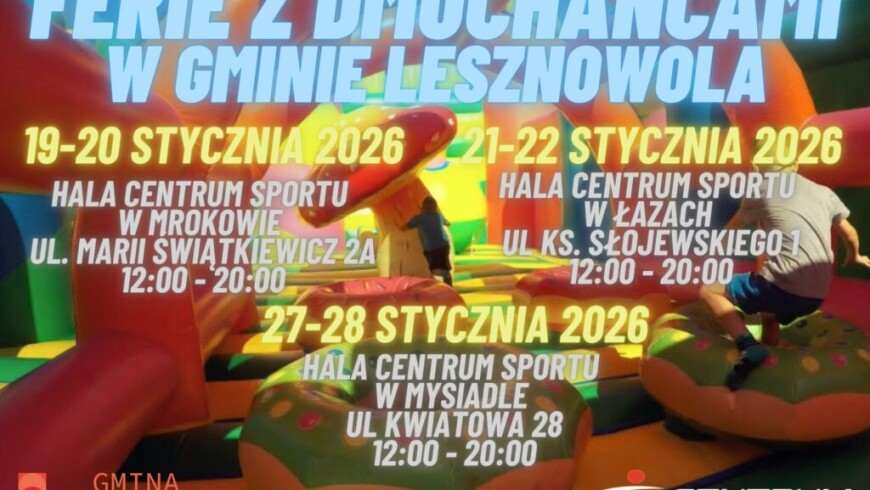 Serdecznie zapraszamy najmłodszych mieszkańców Gminy Lesznowola na "Ferie z dmuchańcami w Gminie Lesznowola", organizowane przez Centrum Sportu w ramach Akcji Zima 2026 w następujących lokalizacjach: